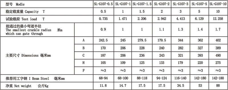 GCL系列手拉单轨行车特点: 1、锻造的经过热处理的跑车轮,牢固耐用,运行平稳,可选配铸造跑车轮。 2、跑车轮有封闭式的轴承,运行更省力。 3、起重量1/2Ton-10Ton。 4、过弯能力良好